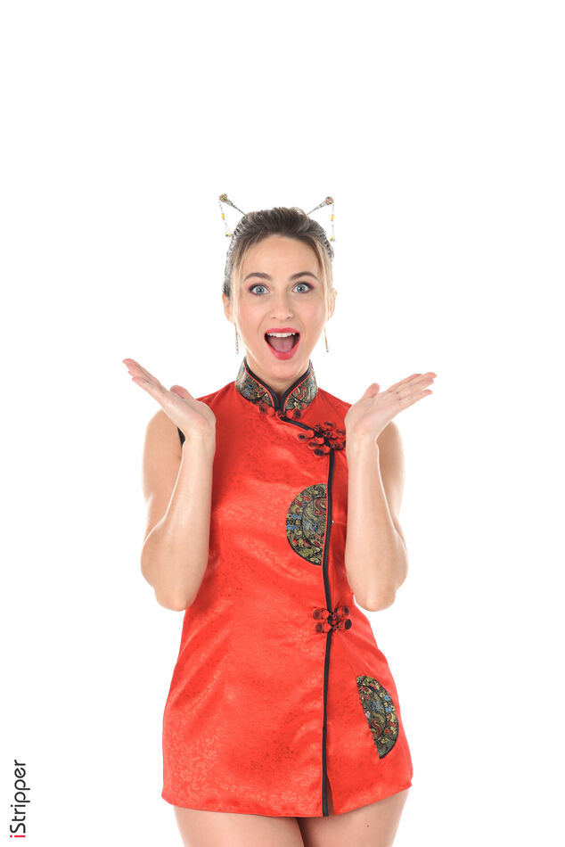 BLONDE CUTIE CARA MELL UNBUTTONS A RED CHINESE DRESS